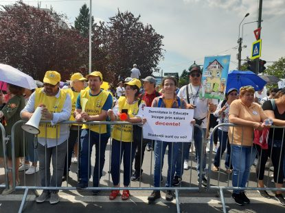 Angajații din educație au venit la protest cu fluiere, vuvuzele, bannere cu însemnele sindicatului din care fac parte și numeroase pancarte pe care au afișat tot felul de mesaje adresate guvernanților: “Fără educație, dispărem ca nație”, “Cu vocația nu stopezi inflația”, “Voi ați prosperat, România a eșuat” sau “Voi cu speciale, noi cu sociale”, “La magazin, nu pot plăti cu vocație, “Anul viitor la vot, o să plătiți pentru tot”.