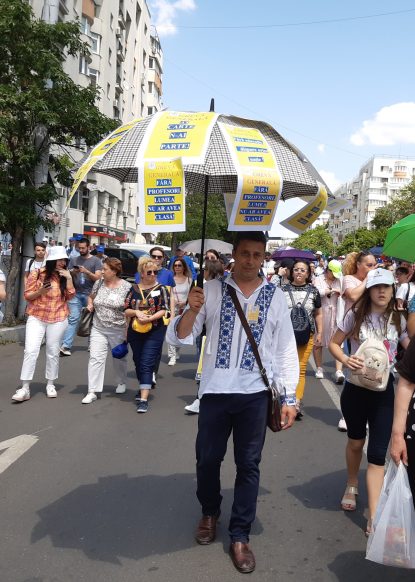 Marian Simion, profesor de religie la Școală Gimnaziale Anton Pann din Voluntari a venit la protest cu o umbrelă pe care a lipit mai multe mesaje: “Ai carte, n-ai parte!” ” Fără educație moare orice nație”, ” Fără profesori, lumea nu ar avea clasă”.