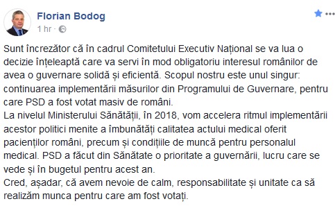 Lăudat recent de premierul Mihai Tudose pentru perseverență, în ciuda ritmului „ardelenesc”, ministrul Sănătăţii, Florian Bodog, a luat o poziție publică mai degrabă neutră. Într-un mesaj pe Facebook, Florian Bodog se declară „încrezător” că în conducerea partidului „se va lua o decizie înţeleaptă”. „Cred că avem nevoie de calm, responsabilitate şi unitate ca să realizăm munca pentru care am fost votaţi”, scrie ministrul Sănătății.