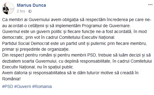 La rândul său, ministrul Tineretului şi Sportului, Marius Dunca, le sugerează colegilor să nu mai dezbată suboiectul în spațiul public înainte de a-l fi discutat în partid. „Guvernul este un guvern politic şi fiecare funcţie ne-a fost acordată, în mod democratic, prin vot în cadrul Comitetului Executiv Naţional. Din respect pentru români şi pentru membrii PSD, trebuie să luăm decizii şi să dezbatem soarta Guvernului, cu deplină responsabilitate, în cadrul Comitetului Executiv Naţional, nu în spaţiul public“, arată Marius Dunca.