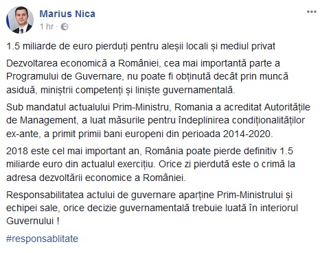 O poziție fără echivoc a luat și Marius Nica. Fost consilier al lui Mihai Tudose, ministrul Fondurilor Europene susține că nu ar trebui să existe decizie guvernamentală care să fie luată la partid. „2018 este cel mai important an, România poate pierde definitiv 1,5 miliarde euro din actualul exerciţiu. Orice zi pierdută este o crimă la adresa dezvoltării economice a României. Responsabilitatea actului de guvernare aparţine prim-ministrului şi echipei sale, orice decizie guvernamentală trebuie luată în interiorul Guvernului!”, arată Marius Nica.