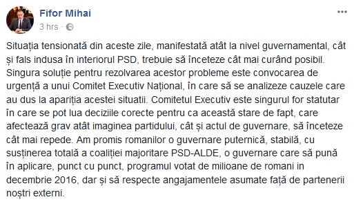 Ministrul Apărării Naţionale, Mihai Fifor, arată, la rândul său, că “situaţia tensionată” manifestată atât la nivel guvernamental, cât şi “fals indusă” în interiorul PSD trebuie să înceteze”. „Am promis românilor o guvernare puternică, stabilă, cu susţinerea totală a coaliţiei majoritare PSD-ALDE, o guvernare care să pună în aplicare, punct cu punct, programul votat de milioane de români în decembrie 2016, dar şi să respecte angajamentele asumate faţă de partenerii noştri externi”, scrie Mihai Fifor.