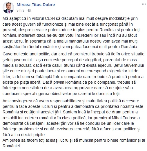 În trena sa, ministrul Turismului, Mircea Titus Dobre, la rândul său parlamentar de Constanța, își declară deschis susținerea pentru Mihai Tudose și pledează pentru a i se da premierului puterea reală de șef al Guvernului. „Șeful Guvernului știe cu ce miniștri poate lucra și ce oameni nu corespund exigențelor lui de lider, la fel cum se întâmplă într-o companie care trebuie să producă pentru a exista pe piața liberă. (…) Suntem încă la început de drum pentru a restabili încrederea românilor în clasa politică, iar premierul Mihai Tudose a demonstrat că cetățenii acestei țări vor să fie conduși de un lider care le înțelege problemele și caută rezolvarea corectă, fără a face jocuri politice și fără a lua decizii pripite”, a scris ministrul Turismului tot pe Facebook.