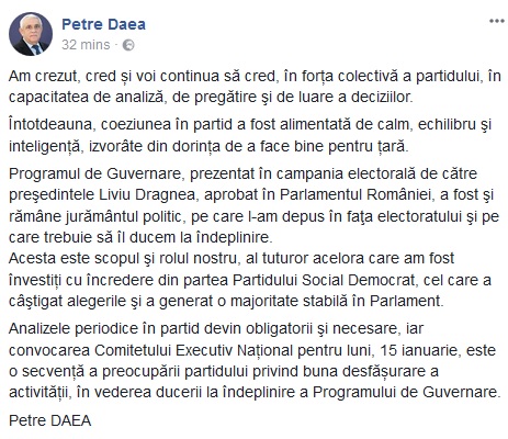 Favoritul premierului, Petre Daea, ține linia neutralității. Ministrul Agriculturii face un apel la „calm, echilibru şi inteligență”, dar nu exclude o reevaluare în partid a unor miniștri. „Analizele periodice în partid devin obligatorii şi necesare, iar convocarea Comitetului Executiv Național pentru luni, 15 ianuarie, este o secvență a preocupării partidului privind buna desfășurare a activității, în vederea ducerii la îndeplinire a Programului de Guvernare”, scrie pe Facebook Petre Daea.