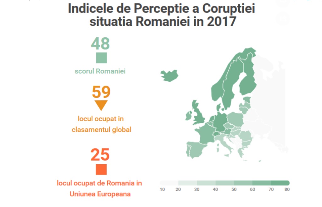 Cu un scor de 48 de puncte, România ocupă locul 59 la nivel global. La nivelul Uniunii Europene, România se află pe a 25-a poziţie, la egalitate cu Grecia.