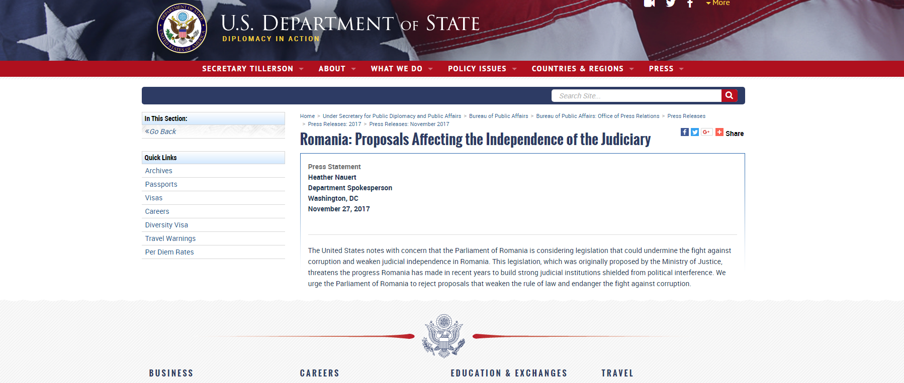 Statele Unite ale Americii au aflat cu îngrijorare că Parlamentul de la București ia în considerare să modifice legile Justiției – lucru care ar putea submina lupta împotriva corupției și ar putea slăbi independența sistemului judiciar din România, se arată într-un comunicat al Departamentului de Stat.