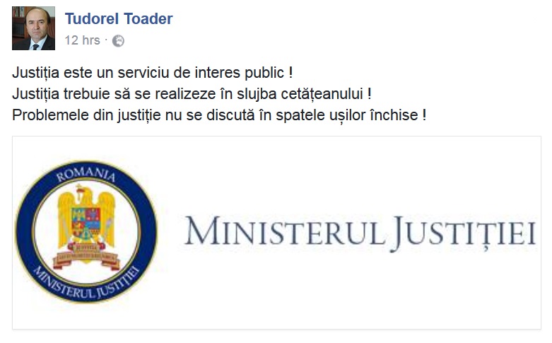 ‘Justiţia este un serviciu de interes public! Justiţia trebuie să se realizeze în slujba cetăţeanului! Problemele din justiţie nu se discută în spatele uşilor închise!’, scrie Tudorel Toader în mesaj.