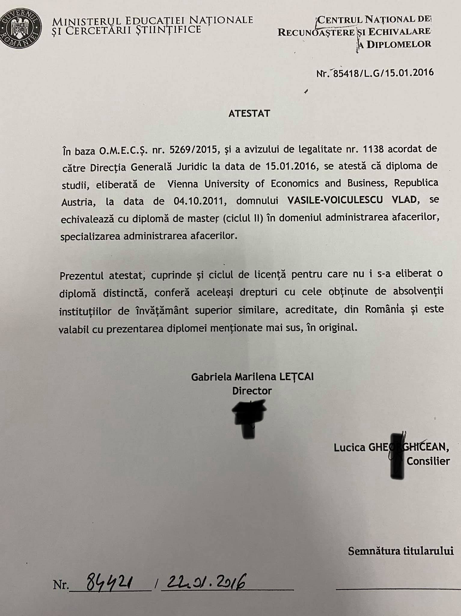 Vlad Voiculescu a publicat și un atestat de echivalare a actului cu o diplomă de master în domeniul administrarea afacerilor.
