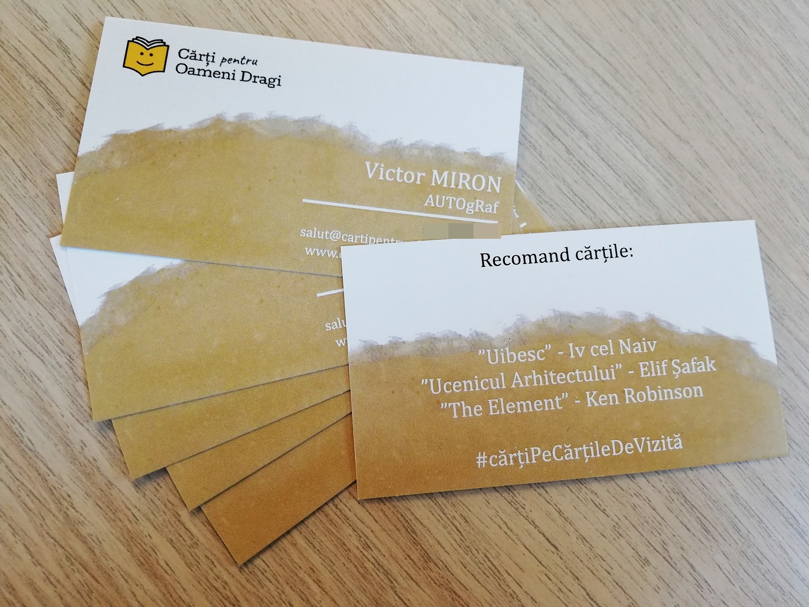 ”După ce timp de cinci ani am încurajat oamenii să își dea Cărțile pe Față, acum îi provocăm să își dea cărțile pe spate, pe spatele cărților de vizită. Cred că poți începe mai ușor o conversație cu o persoană pe care tocmai ai cunoscut-o dacă pornești dialogul de la cărțile care te-au influențat”, spune Victor Miron, inițiatorul campaniei Cărțile pe față.