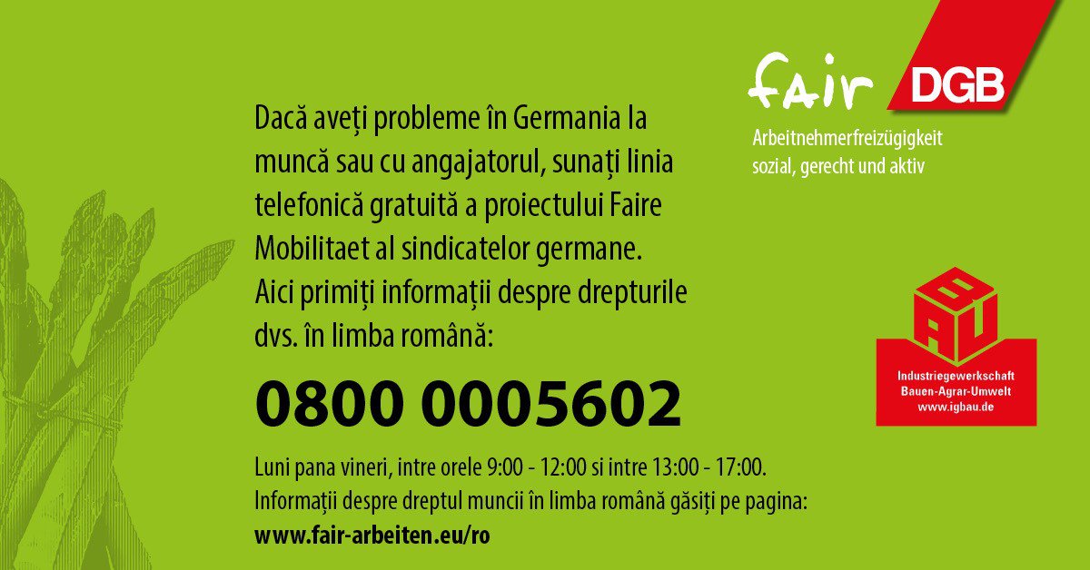 Consilierul român în cadrul proiectului sindicatelor germane și al Ministerului Muncii de la Berlin, îi sfătuiește pe românii care lucrează în Agricultura din Germania să nu accepte mai puțin de 9 euro și 35 de cenți pe oră, brut, din partea fermierilor. Și nici un program de muncă inuman: