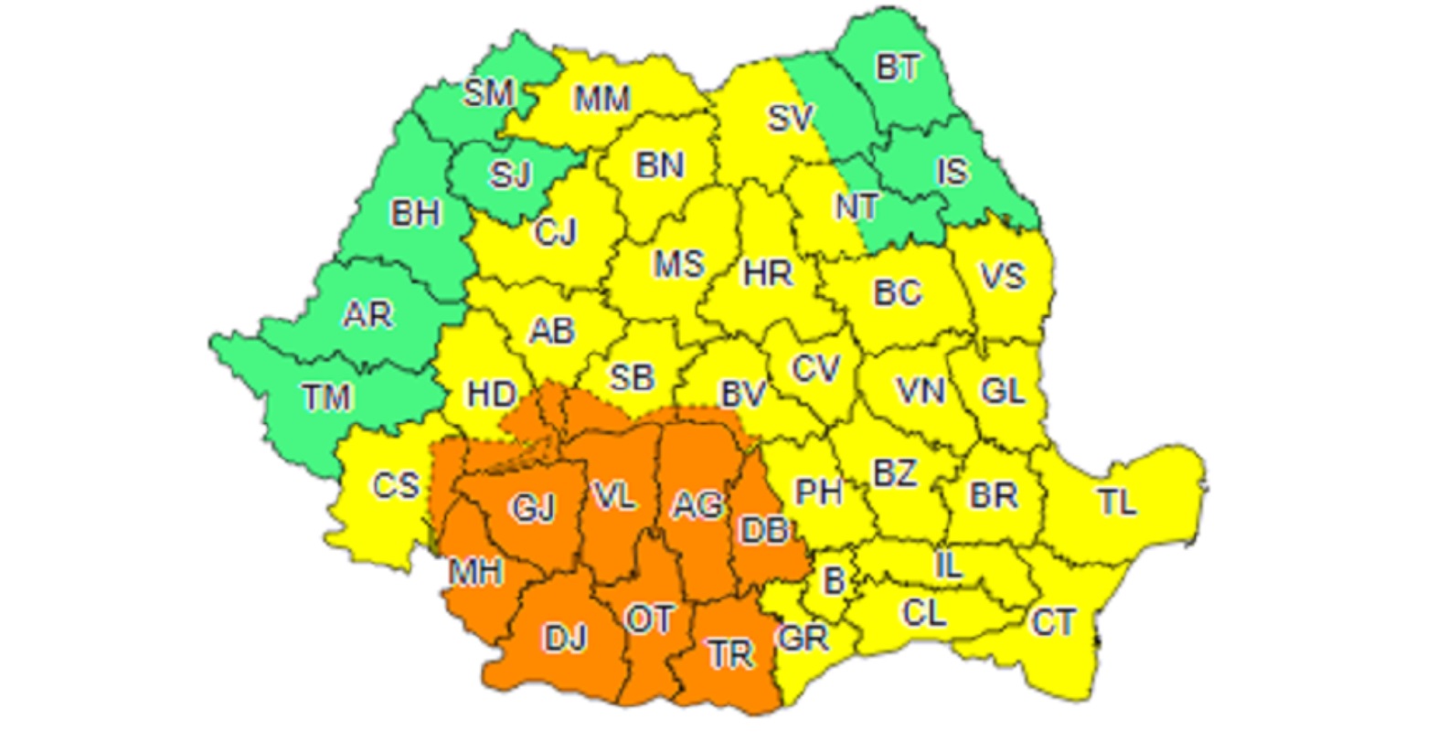 ANM prognozează ploi abundente în Oltenia, vestul şi nord-vestul Munteniei şi local în Carpaţii Meridionali, unde meteorologii anunţă că în intervale scurte de timp, dar mai ales prin acumulare, se vor înregistra cantităţi de apă de 50…90 l/mp. Vor fi perioade în care se vor semnala şi vijelii (viteze de 75…90 km/h), grindină şi frecvente descărcări electrice.