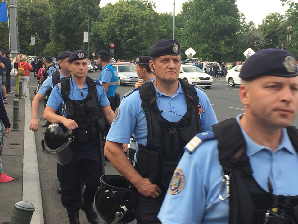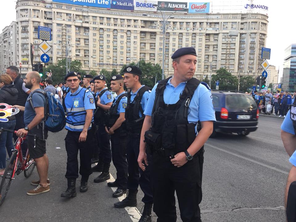 UPDATE 18:40: Mulțimea a intrat peste steagul pictat în mijlocul pieței. Oamenii sunt înconjurați constant de cordonul de jandarmi.