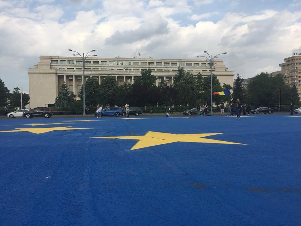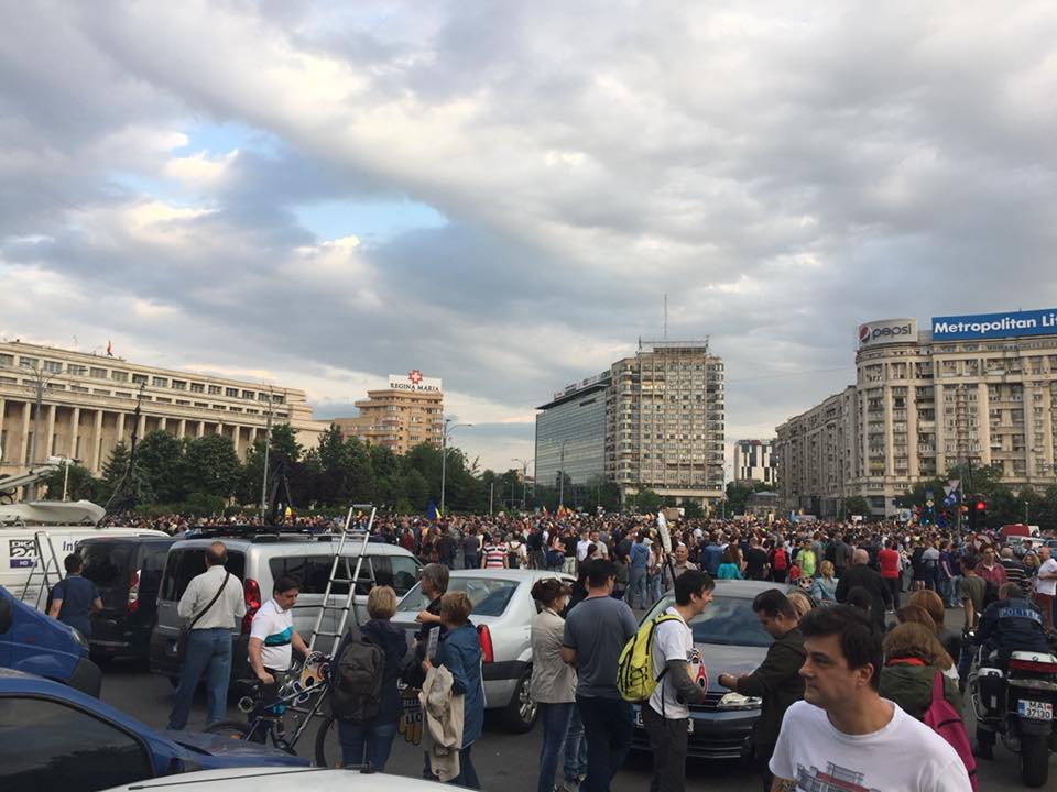 UPDATE 18:30: Tensiuni între protestatari și jandarmi. În mijlocul pieței este pictat un imens steag al Uniunii Europene. Oamenii au ocupat carosabilul spre Muzeul Antipa. Oamenii scandează „Hoții” și „Demisia”. Sunt peste 1.000 de oamenii în piață.