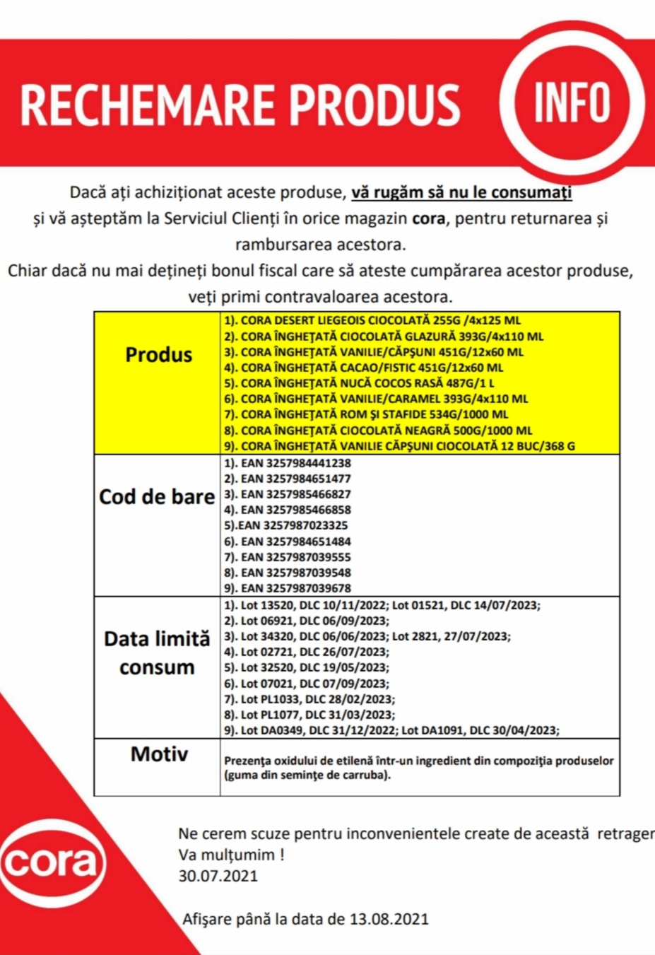 ”Dacă ați achiziționat aceste produse, vă rugăm să nu le consumați și vă așteptăm la Serviciul Clienți în orice magazin Cora, pentru returnarea și rambursarea acestora.