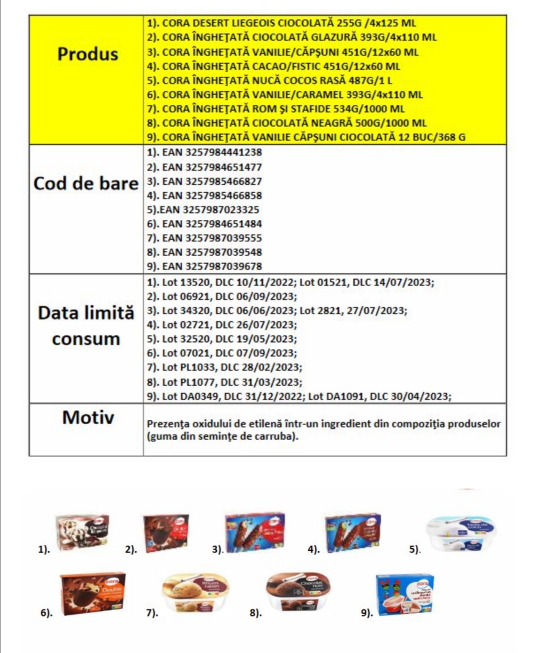 9 sortimente de înghețată, vândute în rețeaua de magazine Cora, sunt retrase de pe piață.