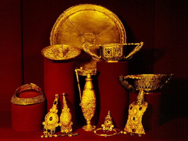 Tezaurul de la Pietroasa este format din 12 piese de aur, care împreună, au 19 kilograme. Sunt bijuterii și vase produse undeva pe teritoriul Imperiului Roman, și probabil, era un fel de mită pentru o căpetenie a goților.