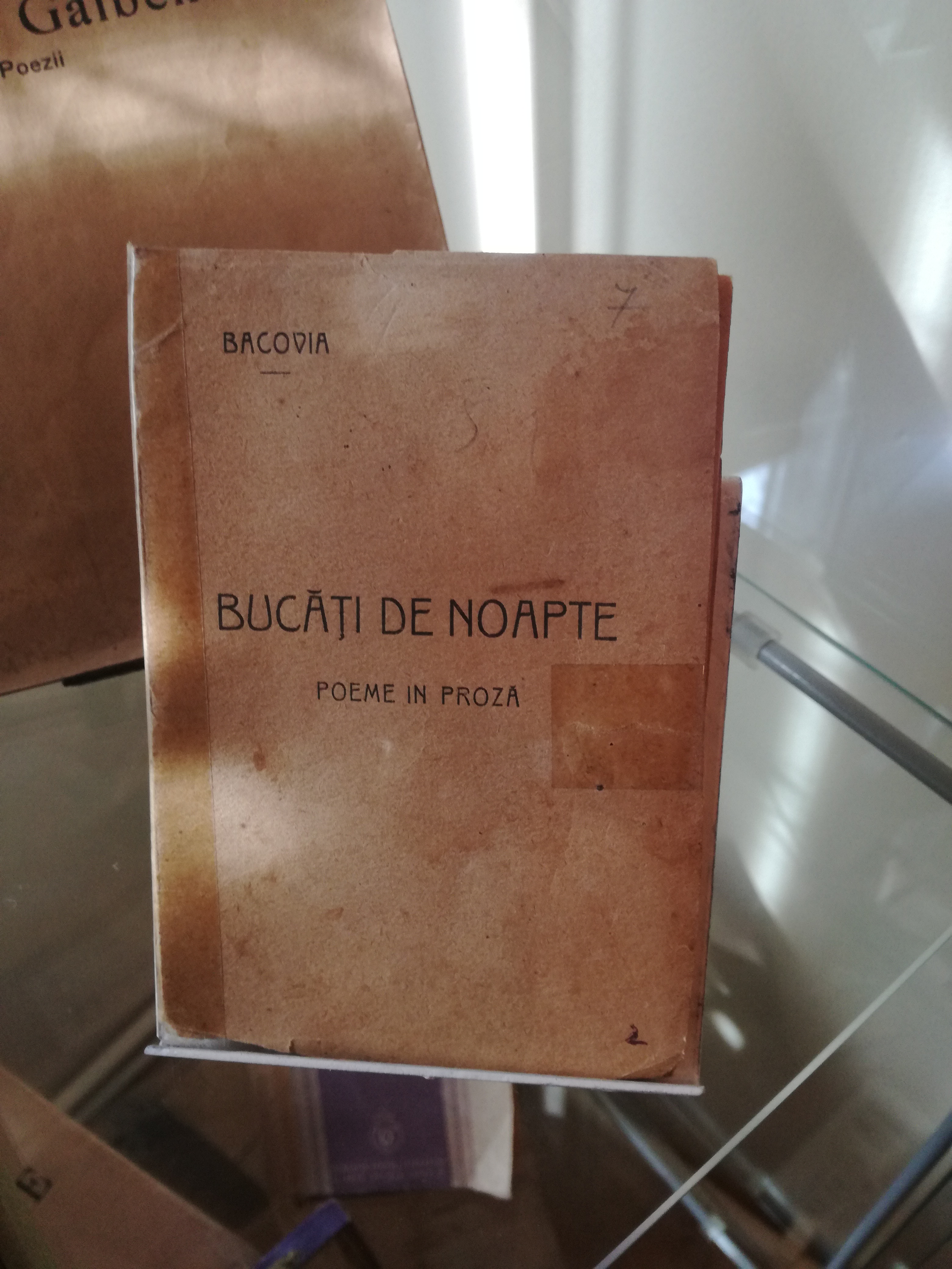 George Bacovia obișnuia să cânte la vioară și în casa memorială se află un instrument care i-a aparținut. Printre edițiile princeps expuse se mai alfă și un exemplar din volumul „Bucăți de noapte”. Într-o bună măsură, cuprinde poezii scrise sub salcia din “Parcul Trandafirilor”, din Bacău. Poezii motolite și aruncate pe jos, dar adunate cu grijă de soția sa, Agatha, care le-a și publicat în volumul respectiv.