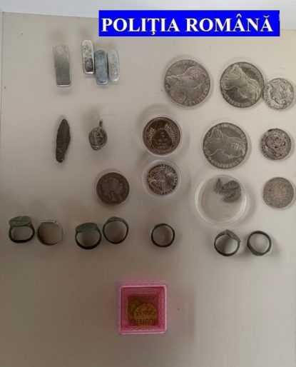 Este vorba despre monede antice, brățări, obiecte de podoabă și alte antichități din perioada romană și epoca bronzului, susceptibile că fac parte din patrimoniul național.