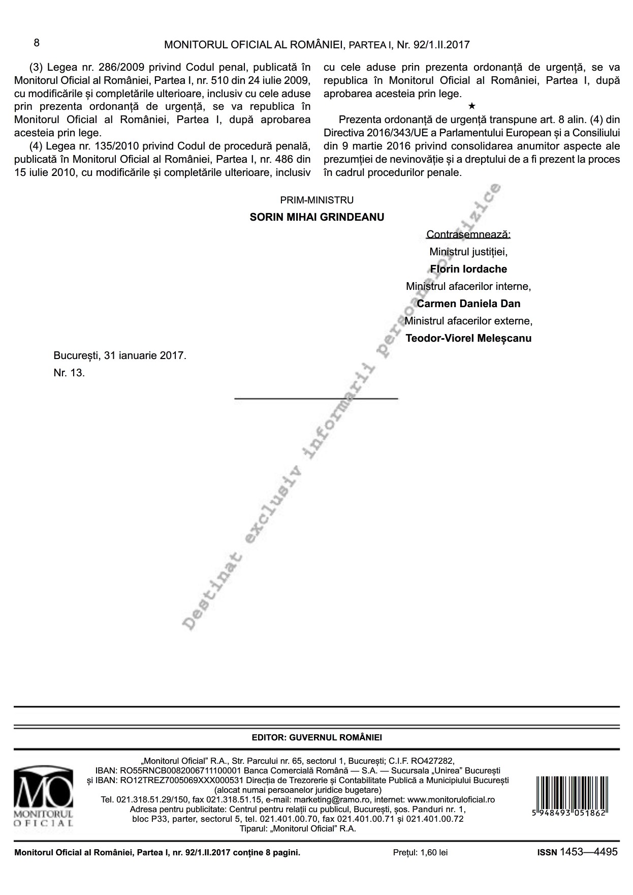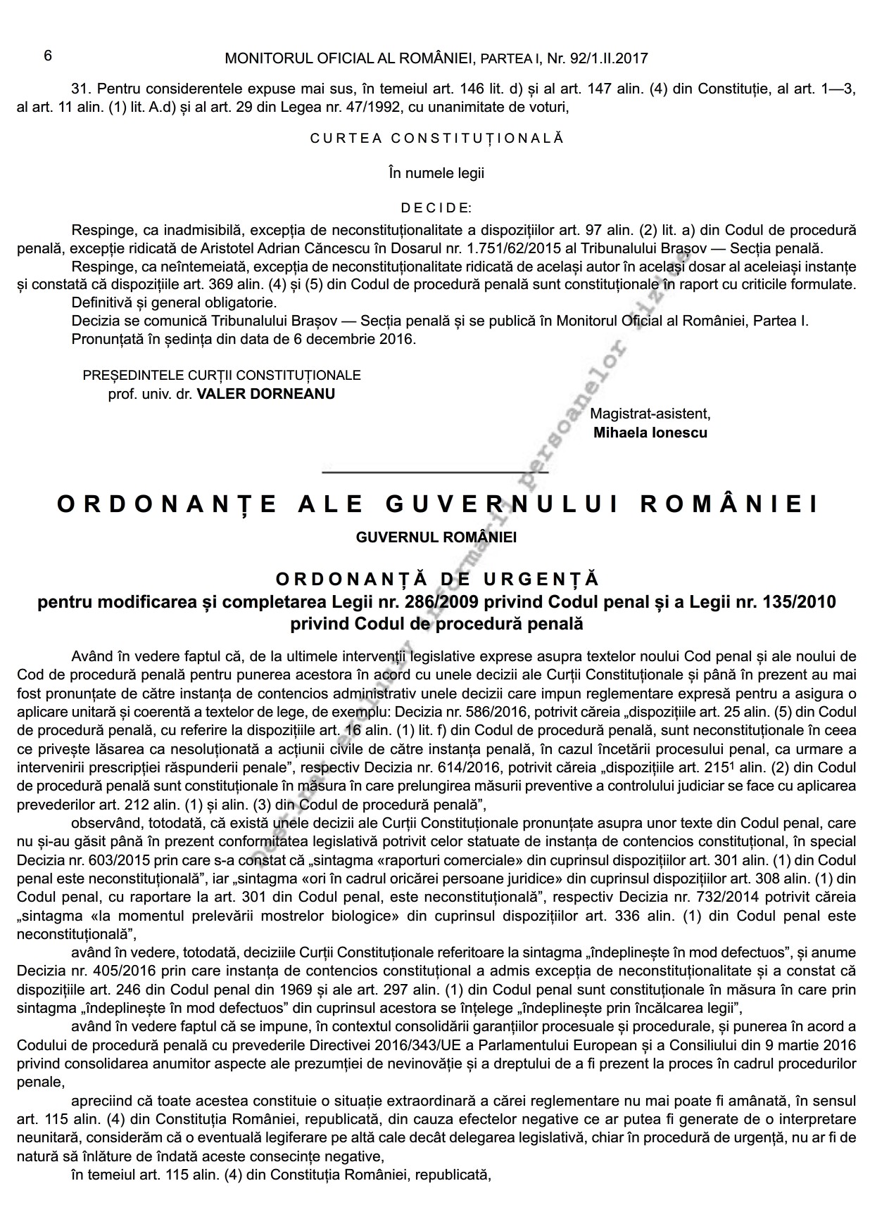 Ordonanţa de Urgenţă adoptată de Guvernul Grindeanu marţi seară privind modificarea codurilor penale a fost publicată în Monitorul Oficial şi urmează să intre în vigoare la 10 zile de la publicare.