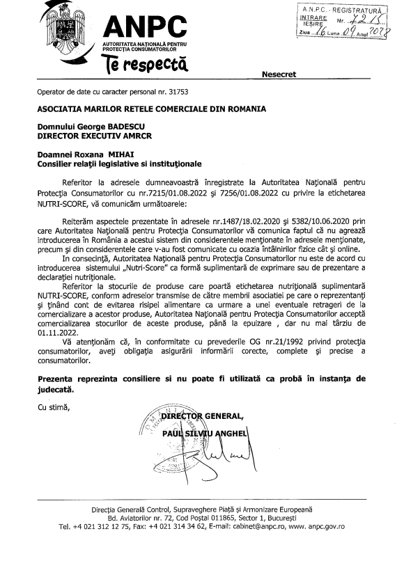 „Nu am primit niciun fel de înștiințare. Noi înșine am făcut adresă la ANPC. Așteptăm până pe data de 28 octombrie, termenul legal de 30 de zile, să ni se spună legea în baza căreia cine nu respectă faptul că elimină nutriscore-ul de pe etichetă săvârșește o contravenție. Înțeleg să nu fie obligatoriu, dar dacă eu vreau să informez pe consumator câte lipide, câte glucide, câte proteine, câte fibre alimentare conține un produs, de ce nu sunt lăsată în pace? Repet, apreciez toată activitatea ANPC-ului”, a spus Bibiana Stanciulov.