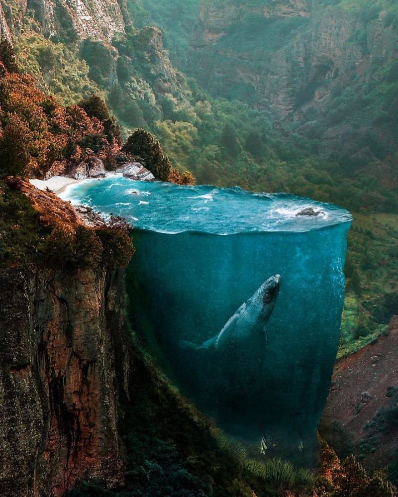 În fotografiile artistului apar o barcă pe autostradă şi o mulţime de pescăruşi, un om pierdut în adâncurile unui lac îngheţat sau o balenă care face un salt într-o mare de nisip.