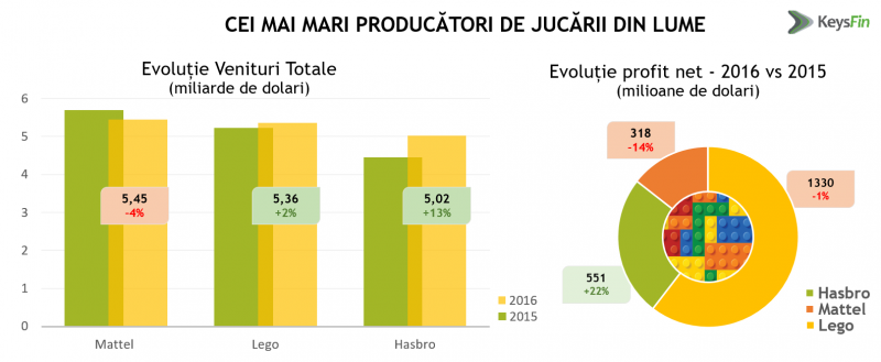 Din punct de vedere al profitabilității, danezii de la Lego au înregistrat în 2016 un profit de peste 4 ori mai mare decât liderii clasamentului după vânzări, americanii de la Mattel.