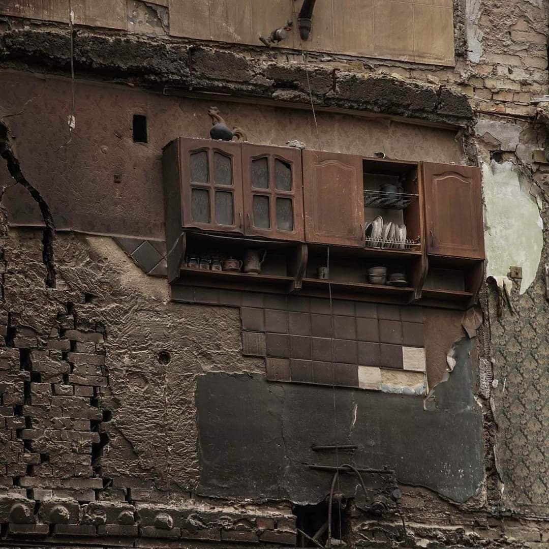 Fotografia cu bufetul suspendat în care farfuriile rămăseseră intacte deși în jur totul era ruină a fost publicată pe rețelele de socializare pe 7 aprilie.
