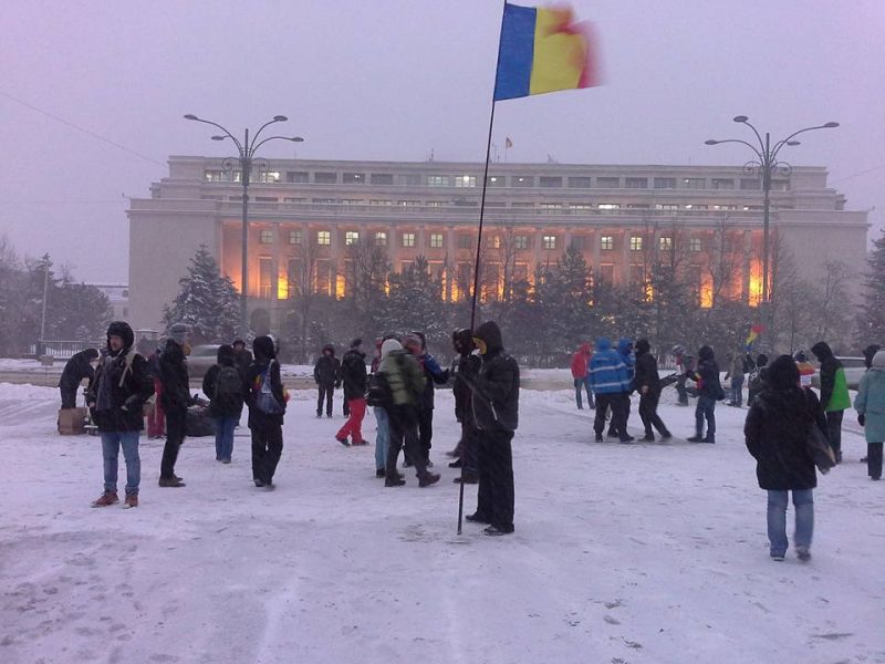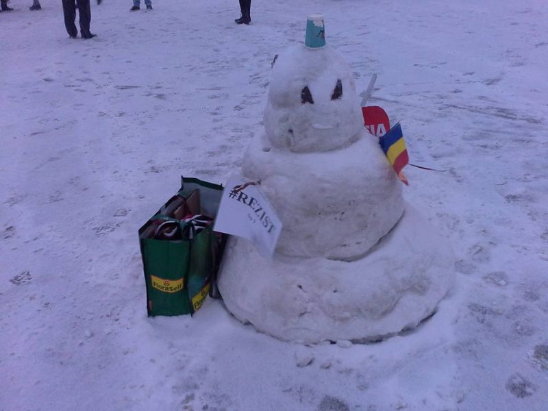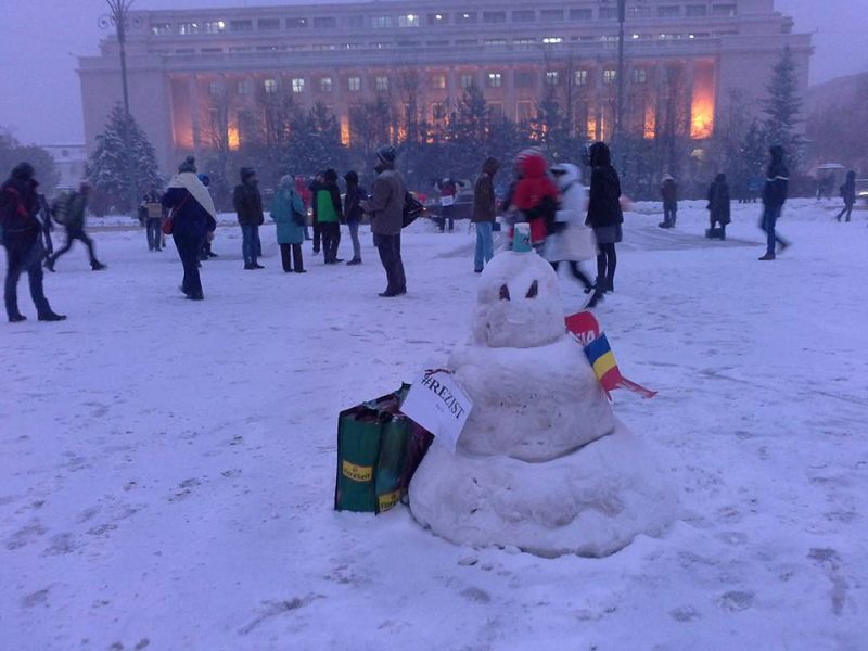 Câțiva tineri au deszăpezit astăzi Piața Victoriei și au făcut oameni de zăpadă care “protestează”.