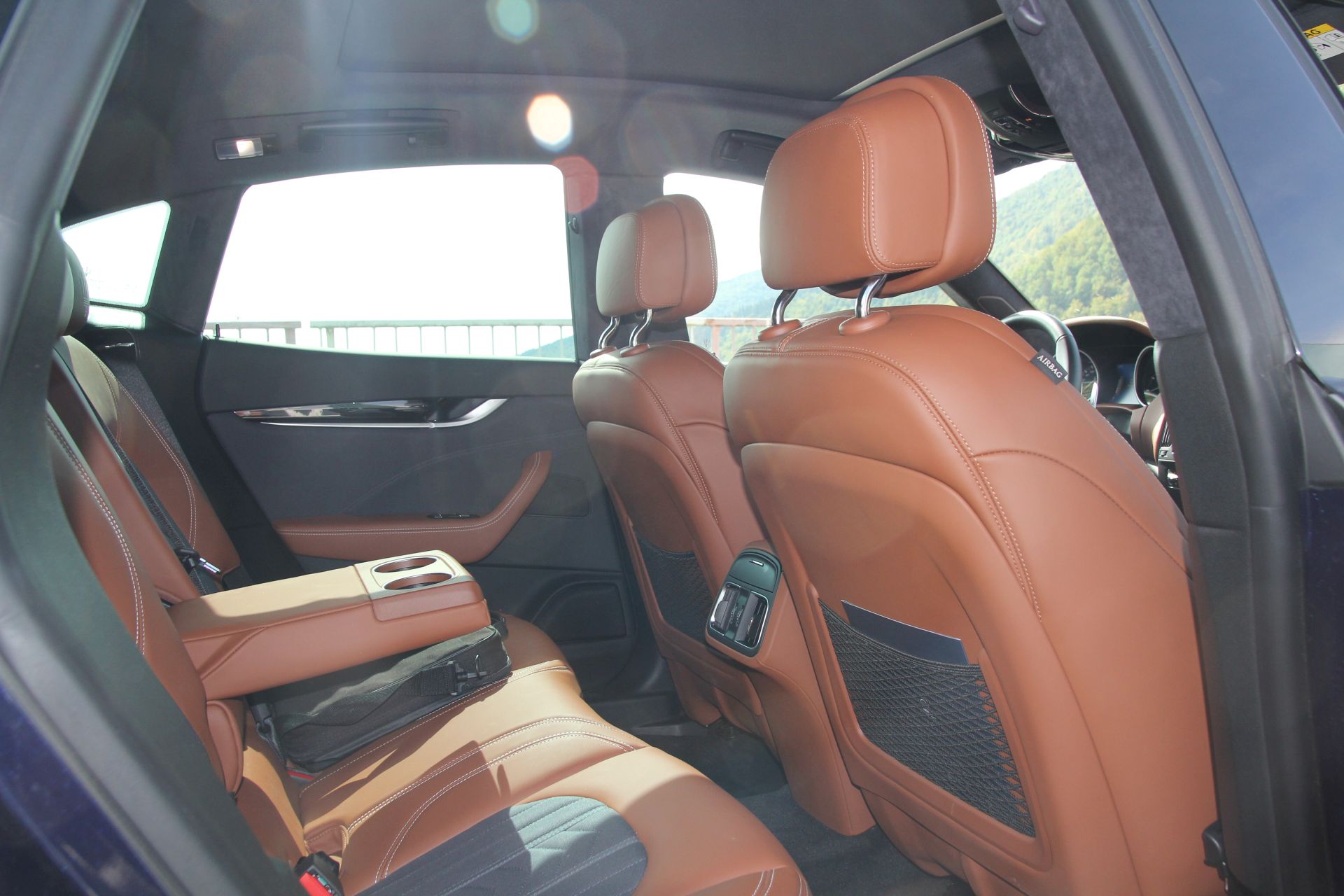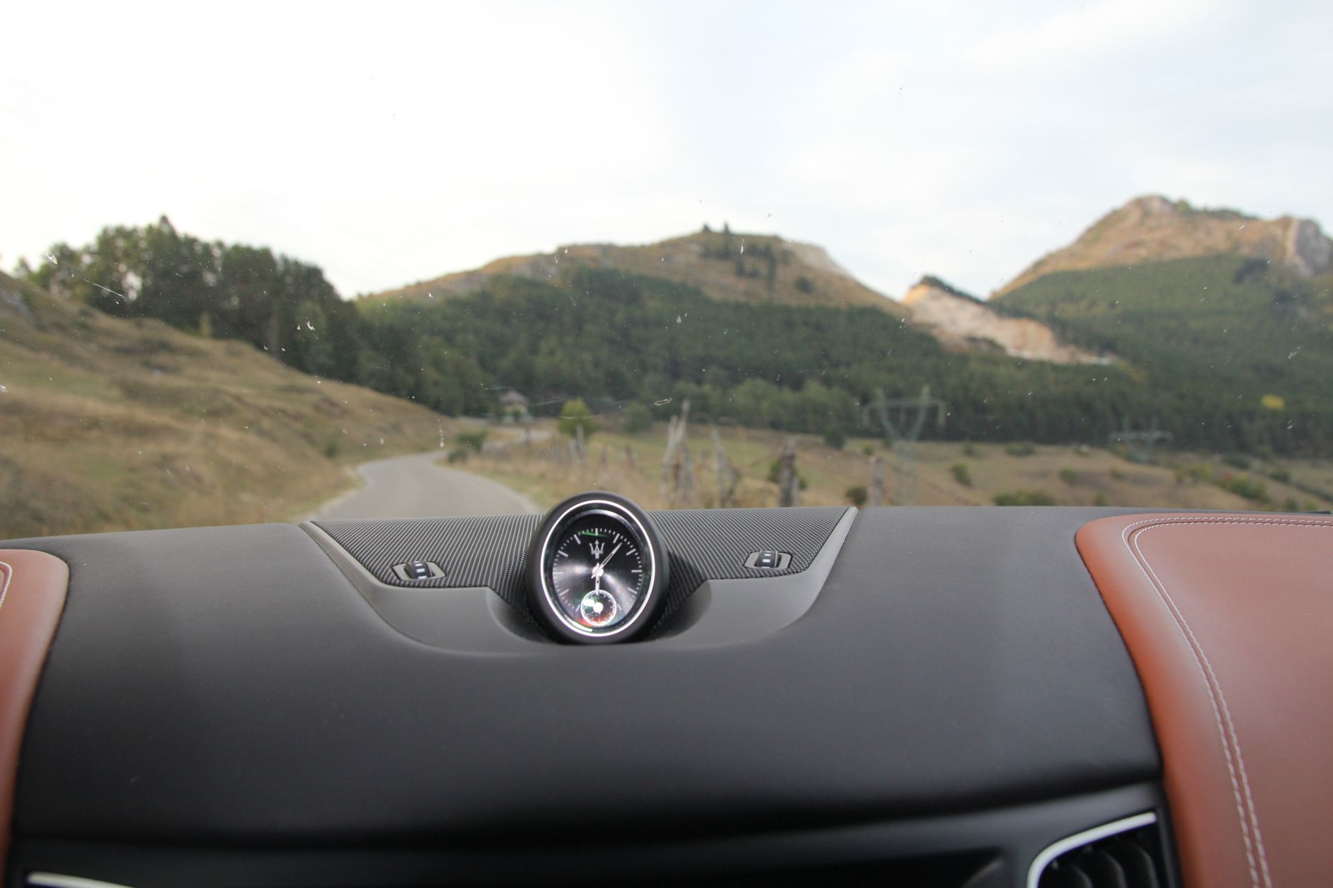 Ceas cu design Maserati, cu ornamente cromate amplasat central pe bord și Logo Maserati pe tetiere (față, spate)