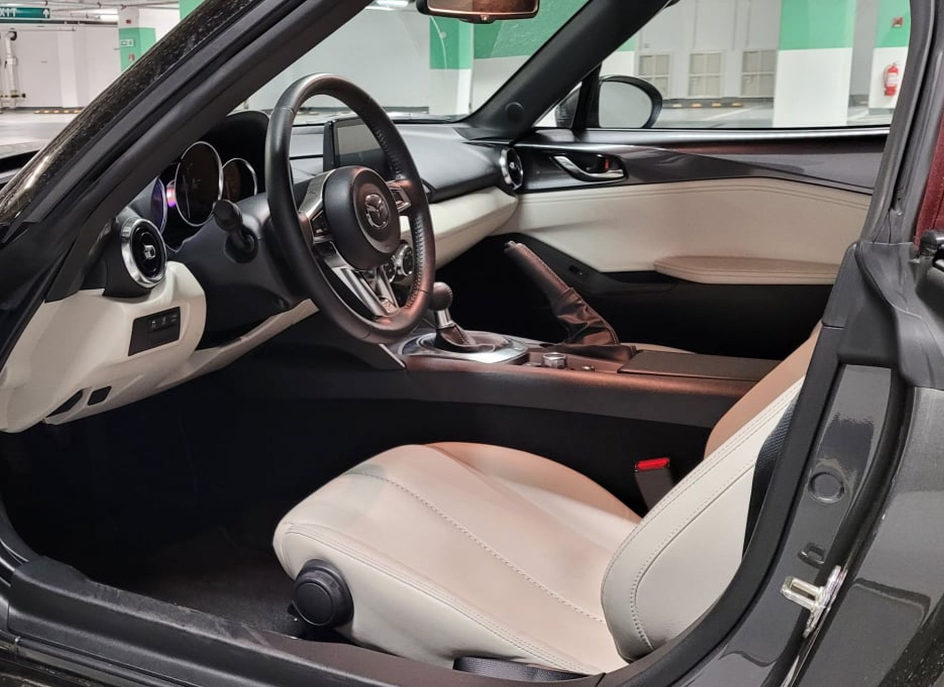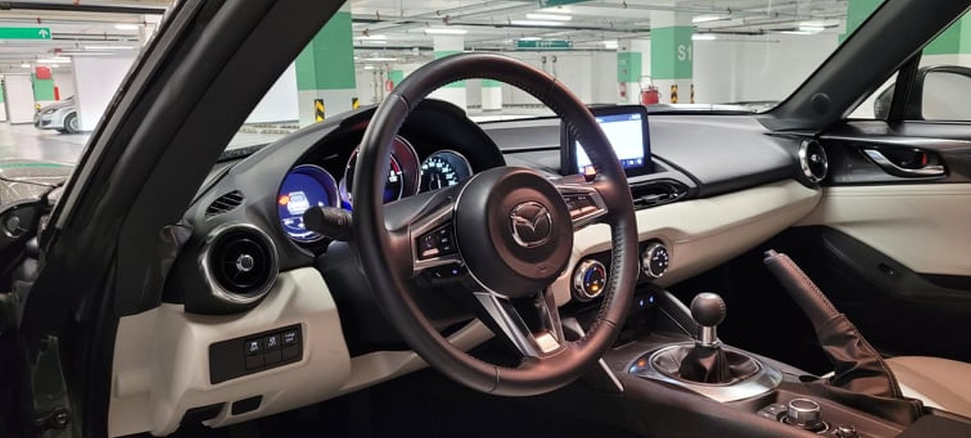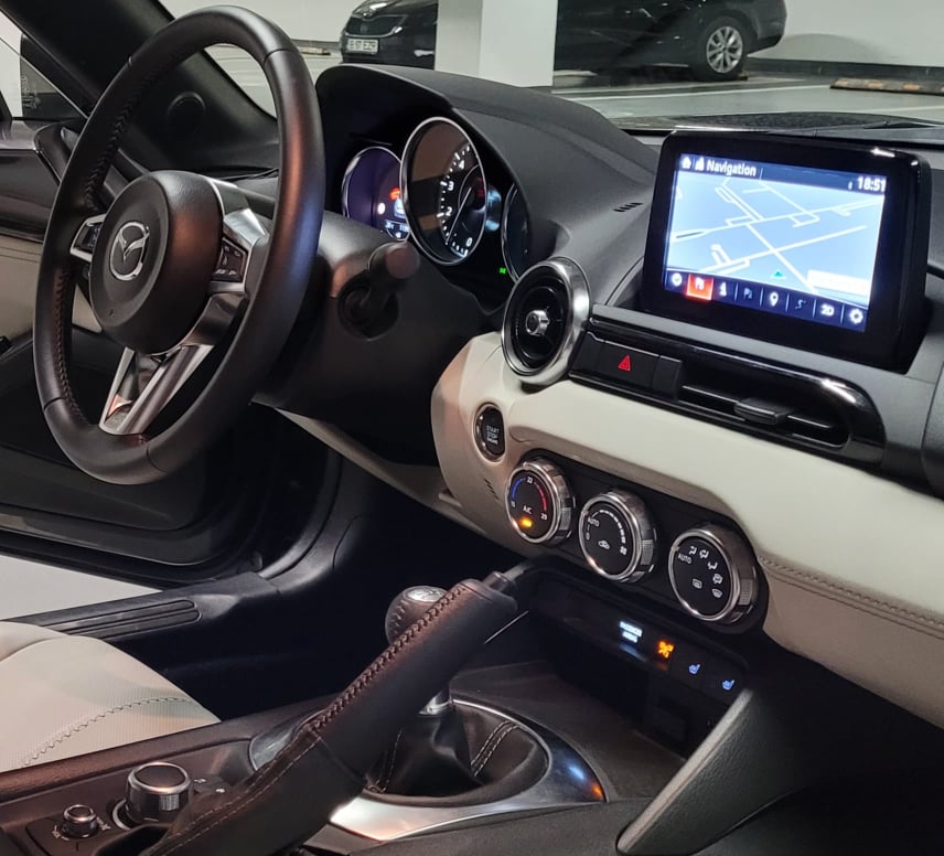 La interior pielea alba imbraca scaunele ,usile si o parte din bord,iar ambianta audio e asigurata de un sistem audio Bose cu 9 difuzoare. Ca tehnologie de conectare modelul dispune de Android Auto si Apple Car Play. MX5 dispune si de camera video pentru marsarier,sistem alerta sofer,sistem de recunoastere a semnelor trafic si asistent inteligent la franarea in oras cu functie pietoni.