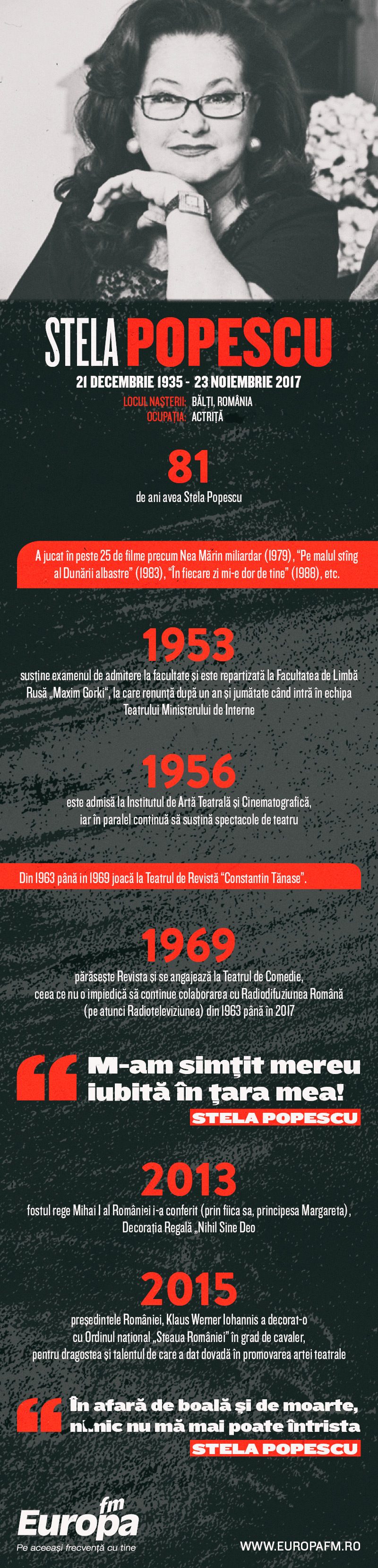 “Cu privire la decesul actritei Stela Popescuva informam urmatoarele: Trupul neinsufletit va fi ridicat si transportat la INML in vederea efectuarii necropsiei pentru a fi clarificate anumite aspecte de natura medicala. Cercetarile sunt efectuate de catre compartimentul Morti Suspecte din cadrul Serv. Omoruri sub coordonarea Parchetului de pe langa Tribunalul Bucuresti.”