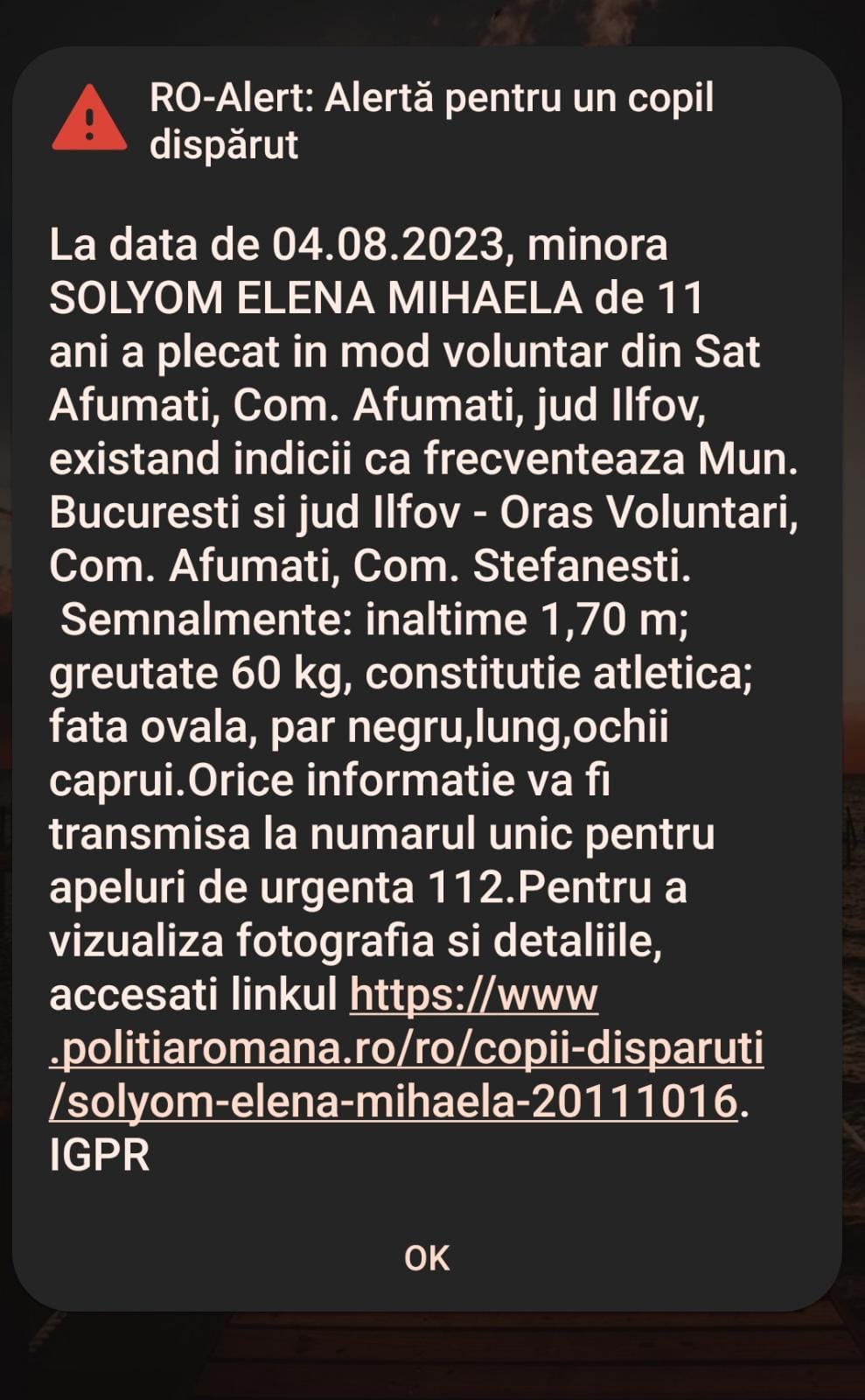 Minora a fost găsită cu ajutorul oamenilor care au văzut mesajul primit prin sistemul RO-ALERT și au alertat forțele de ordine. La data de 4.08.2023, minora Solyom Elena Mihaela de 11 ani a plecat în mod voluntar din Sat Afumați, Comuna Afumați, Județul Ilfov, existând indicii că frecventează Municipiul București și Ilfov – Oraș Voluntari, Comuna Afumați, Comuna Ștefănești. Autoritățile semnalau în urmă cu aproape două ore că minora ar fi fost văzută la o adresă din Sectorul 2. A fost trimis mesaj de tip RO-ALERT.