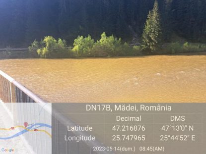 Angajații SGA Suceava au observat, sâmbătă seara, că râul Bistrița, pe raza orașului Broșteni, în zona localității Holda, prezintă o culoare cărămizie specifică poluării cu ape de mină.