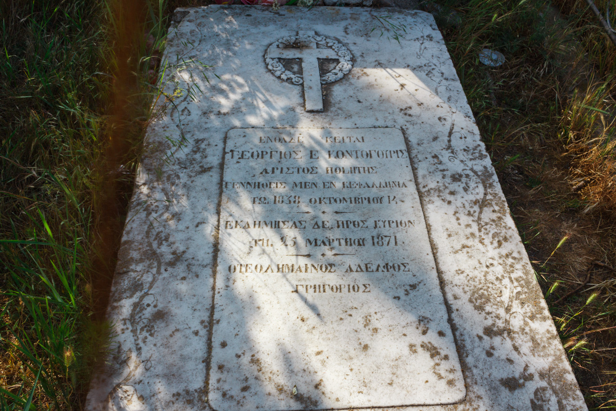 Aici se odihneşte piratul Ghiorghios Kontoguris, care a murit la Sulina, la vârsta de 33 de ani, şi a fost înmormântat de fratele său.
