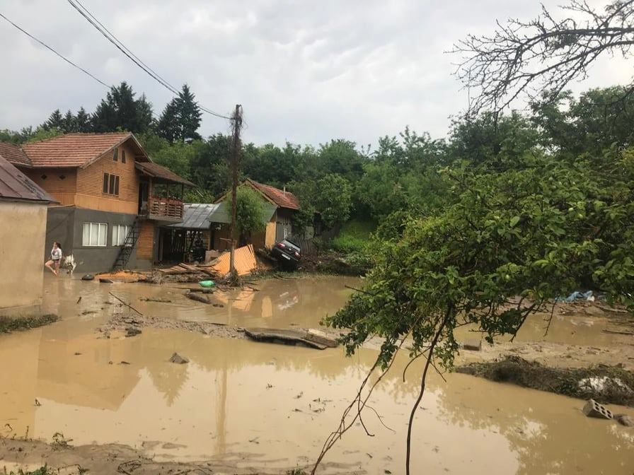 În Lapoș, viitura a distrus mai multe gospodării și mașini, iar un drum comunal este blocat de aluviuni.