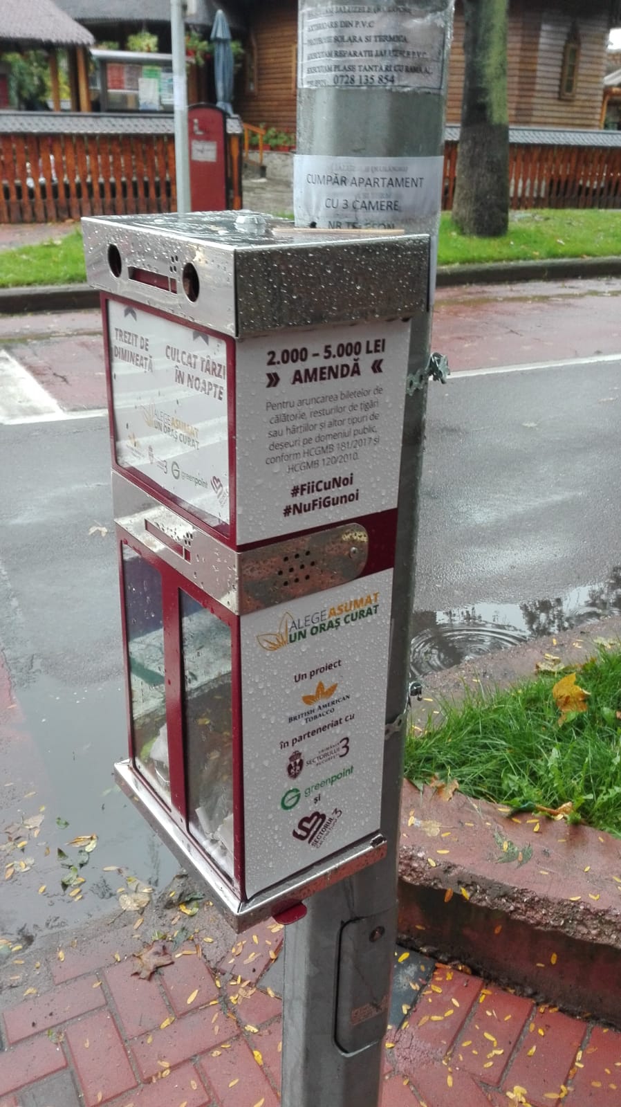 ‘’Fii cu noi, nu fi gunoi!’’ scrie pe cutiuțele roșii atașate de stâlpi, în zonele aglomerate din sectorul 3. Autoritățile speră să îi convingă pe fumători să nu mai arunce chiștocul pe jos, fapt sancționat cu amenzi între 2000 și 5000 de lei.
