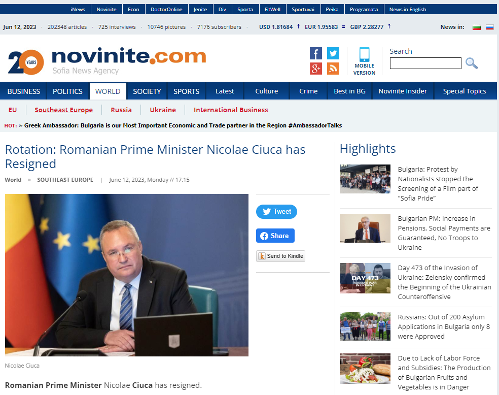 Publicația Novinite din Bulgaria scrie că: „Premierul României, Nicolae Ciuca, a demisionat. El însuși a anunțat acest lucru în cadrul unei conferințe de presă, informează BTA.