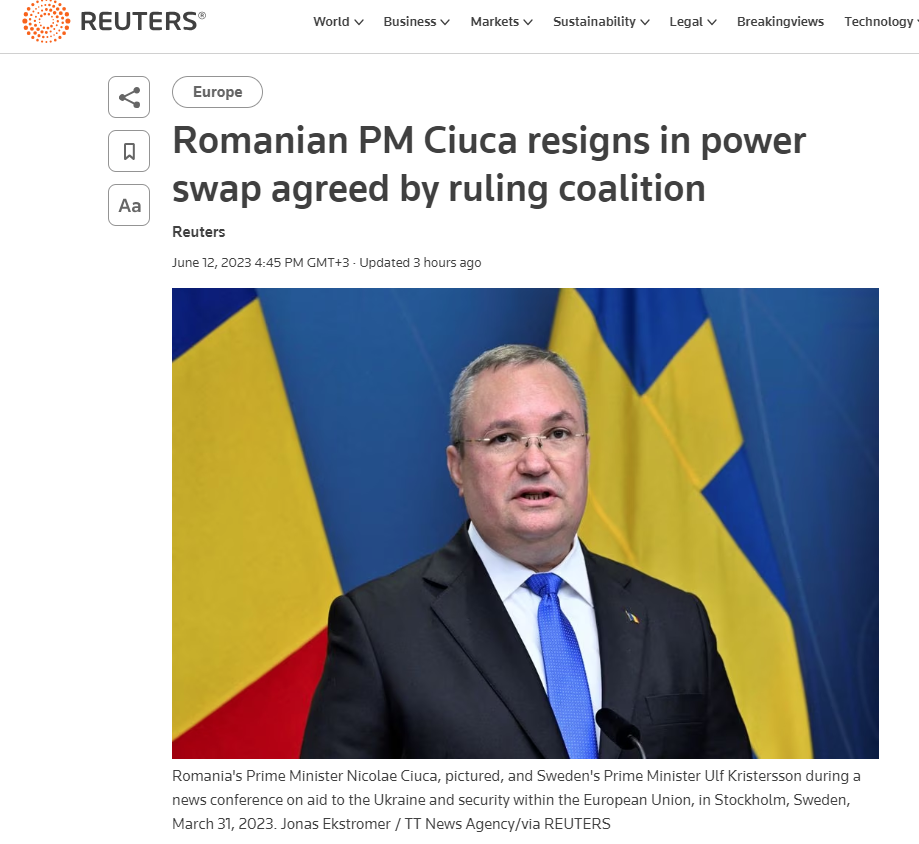 „Prim-ministrul român Nicolae Ciuca a demisionat pentru a ceda funcția de premier unui partener de coaliție, în cadrul unui acord de împărțire a puterii menit să mențină stabilitatea într-o țară afectată de tulburări politice.