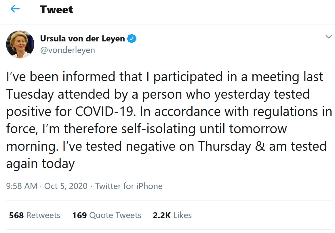 “Am fost informată că am participat marţea trecută la o întâlnire la care a asistat o persoană testată ieri pozitiv la COVID-19. În conformitate cu regulile în vigoare, mă autoizolez, prin urmare, până mâine dimineaţă. Am fost testată negativ joi şi voi fi testată din nou astăzi”, a anunțat Ursula von der Leyen pe Twitter.