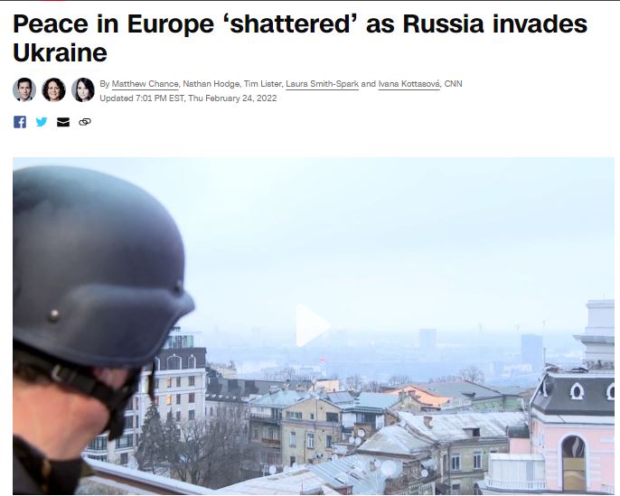 „Pacea în Europa, întreruptă de invazia Rusiei în Ucraina”, titra CNN pe prima pagină a site-ului, în dimineața zilei de 24 februarie. Din Kiev, un corespondent transmitea că în capitala Ucrainei răsună alarmele.