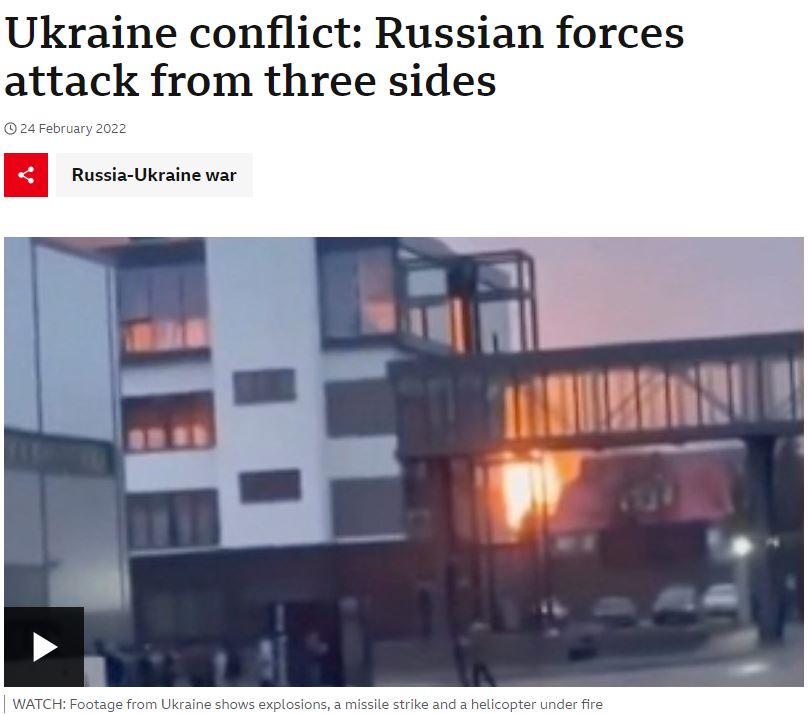 „Conflict Ucraina: Forțele ruse atacă din 3 părți”, era scris pe pagina principala a site-ului BBC în dimineața zilei de 24 februarie 2022.
