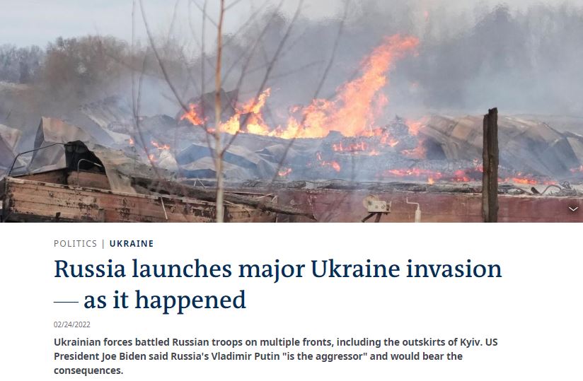 Deutsche Welle deschidea site-ul în 24 februarie cu același anunț: „Rusia a lansat o invazie majoră asupra Ucrainei – pe măsură ce se întâmplă”.