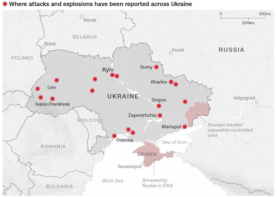 Câteva ore mai târziu, pe site-ul CNN apărea o hartă cu atacurile rușilor asupra Ucrainei din dimineața zilei de 24 februarie 2022.