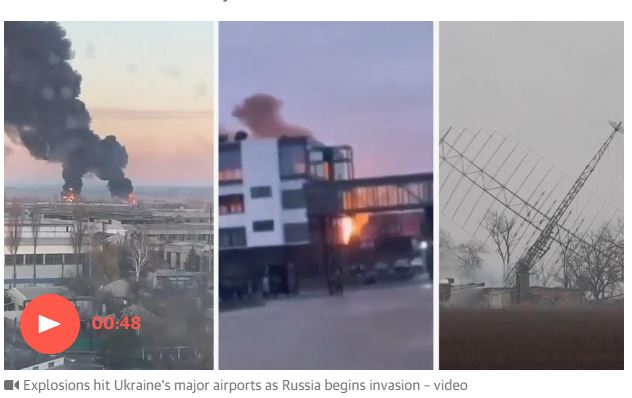 La câteva minute după ce Vladimir Putin a încheiat săptămâni agonizante de speculația prin anunțarea unei „operațiuni militare speciale” în dimineața zilei de joi, explozii au fost auzite în apropiere de majoritatea orașelor ucrainene. Potrivit oficialilor ucraineni, valul inițial de atacuri pare să implice rachete, artilerie și atacuri aeriene, ce au lovit infrastructura, punctele de la graniță, inclusiv baze aeriene”, scriau jurnaliștii britanici în primele ore ale invaziei ruse.
