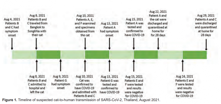 Un medic veterinar din Thailanda, o femeie în vârstă de 32 de ani, a fost diagnosticată cu COVID-19 după ce o pisică a strănutat în fața ei. Studiul genetic al specialiștilor în medicină a indicat că SARS-CoV-2 s-a transmis de la stăpân la pisică, iar mai apoi de la pisică la medicul veterinar.