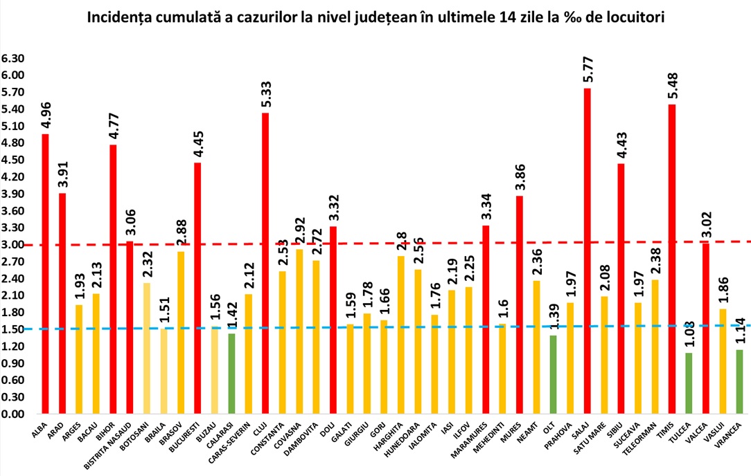Trei judeţe din ţara noastră sunt în acest moment în zona verde a incidenţei – Vrancea, Tulcea şi Călăraşi, adică sunt mai puţin de 1,5 îmbolnăviri la mia de locuitori.