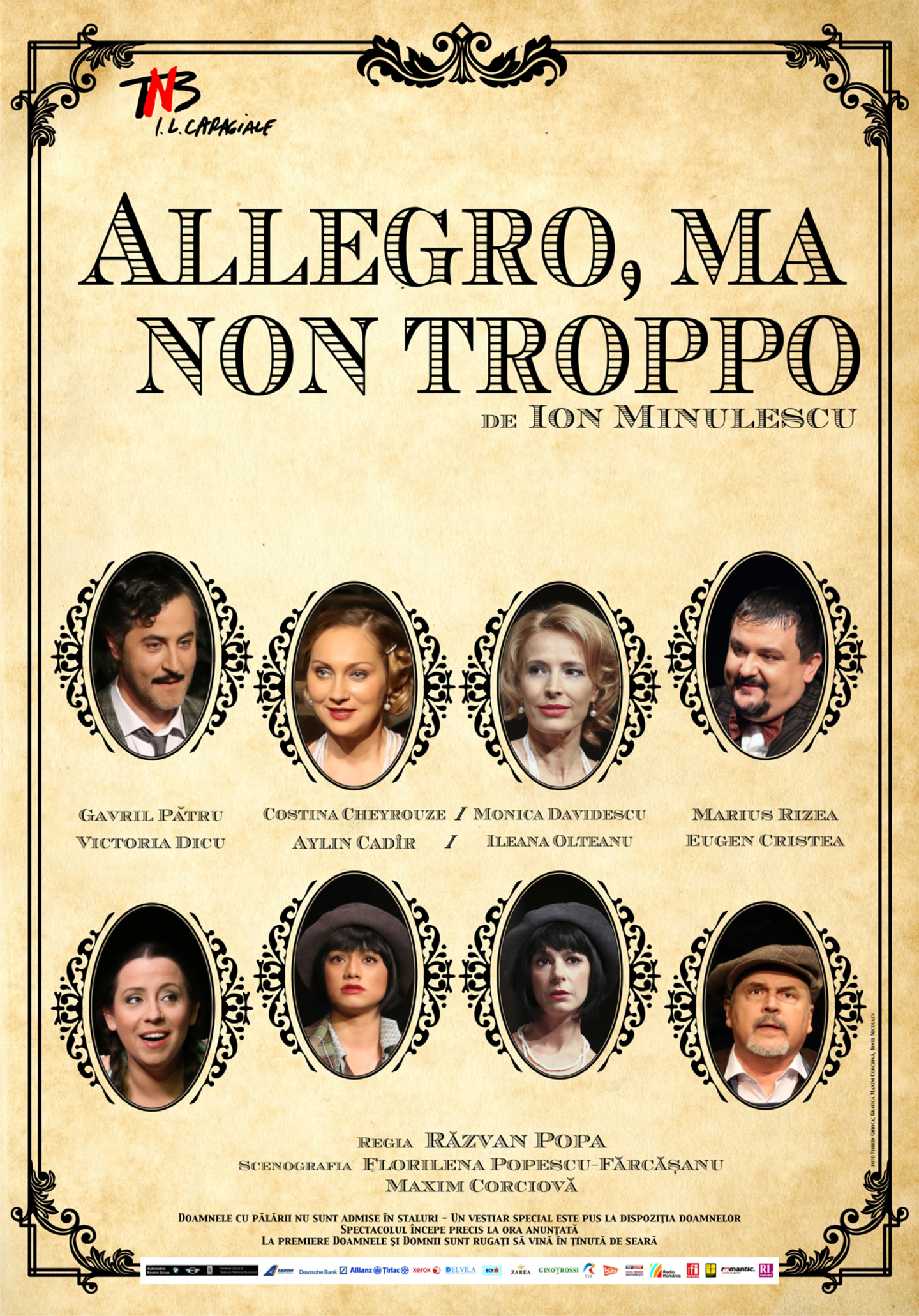 Tot vineri, 4 ianuarie 2019, de la ora 20.00, este programat spectacolul „Allegro, ma non troppo”, de Ion Minulescu, la Sala Pictură a Teatrului Național București. Regia: Răzvan Popa.