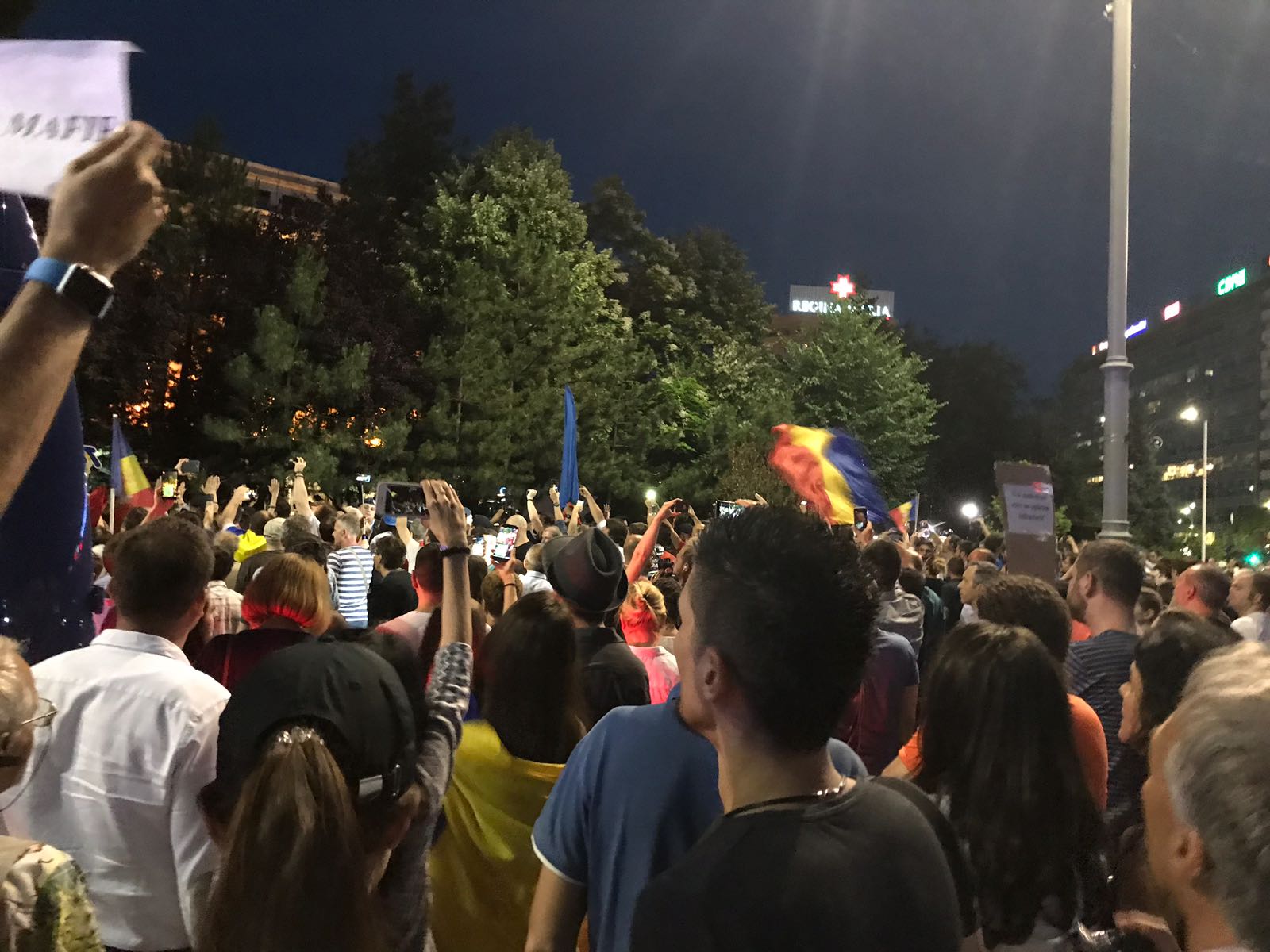 Update ora 22:30: Mulțimea strigă “Analfabeta, analfabeta!” la adresa Vioricăi Dancilă. Apoi : “Demisia!”. Numărul oamenilor a mai scăzut, sunt sub 2.000 de oameni acum. Oamenii sunt mai liniștiți si spiritele s-au mai calmat. Ei au afişat pancarte cu mesaje referitoare la judecătorii Curţii, dar şi la actuala putere: ”CCR – ruşinea ţării”; ”Noi suntem cei care nu apărăm infractorii”; ”Toader şi Dorneanu şi-au trădat iar neamul”; ”CCR, sluga PSD”.