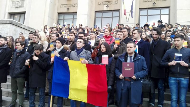 Protestul este – ca și cel al magistraților de zilele trecute, unul tăcut, tinerii stând pe treptele instituţiei de învăţământ cu Constituţia în mâini.