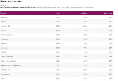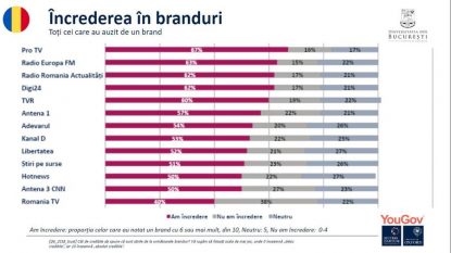 În topul celor mai de încredere branduri media, pe locul 1 se situează Pro TV (67%), urmat de Radio Europa FM (63%), iar pe locul trei se află Digi 24, la egalitate cu Radio România Actualități (62%).
